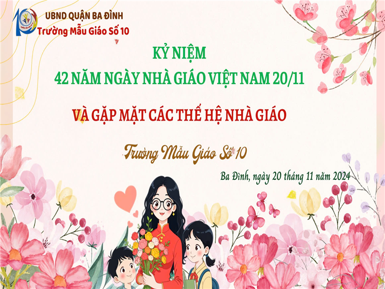 Sáng ngày 20/11/2024, Trường Mẫu Giáo Số 10 đã tổ chức chương trình kỷ niệm 42 năm ngày Nhà giáo Việt Nam (20/11/1982 - 20/11/2024) để ghi nhận và tri ân những đóng góp của các thế hệ thầy cô giáo, viên chức, người lao động cho sự phát triển chung của Nhà trường với chủ đề “Tri ân - Kết nối”