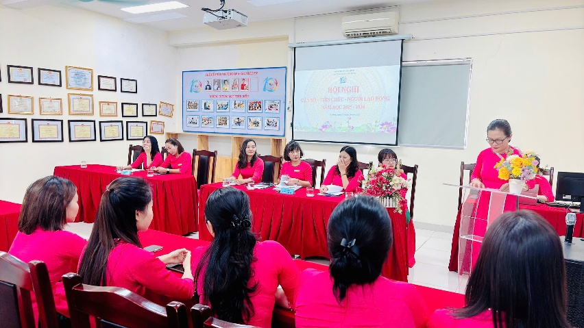 Trong phần nội dung chính, người đứng đầu nhà trường – Hiệu trưởng Lê Thị Trâm Anh đã trình bày Báo cáo tổng kết năm học 2024–2025, nêu bật những kết quả đạt được trong công tác chăm sóc, nuôi dưỡng và giáo dục trẻ, đồng thời chỉ ra những mặt cần tiếp tục phát huy trong năm học mới. Bên cạnh đó, cô cũng trình bày phương hướng, nhiệm vụ năm học 2025–2026 cùng báo cáo kiểm điểm trách nhiệm của người đứng đầu.